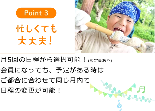 月5回の日程(土・日)から参加するグループを選択できます。また、学校行事やご家庭の予定と重なった場合などは同じ月の他の日程に振り替えることが可能な[日程変更]制度があります。