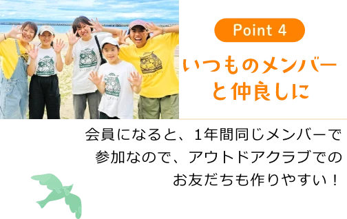 宿泊キャンプに早期申し込みができたり、割引制度があります。また、アウトドアクラブにも単発参加するよりも、半額程度のお得な料金での参加が可能です。ぜひご検討ください。